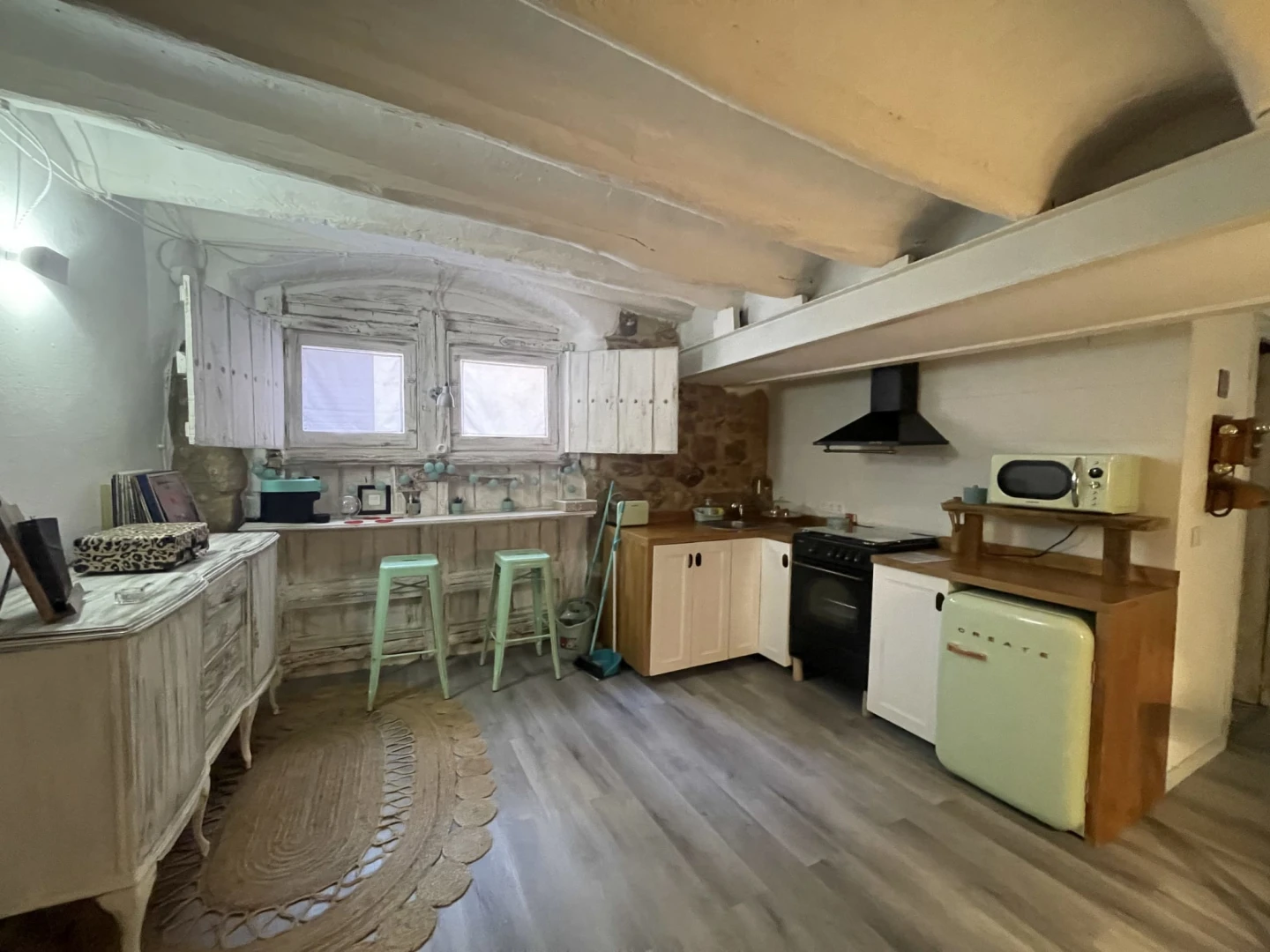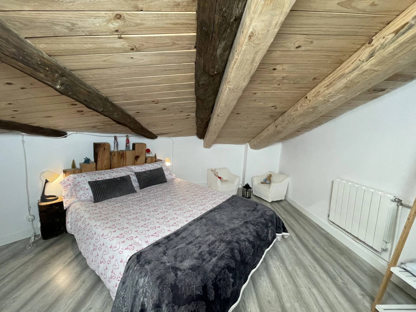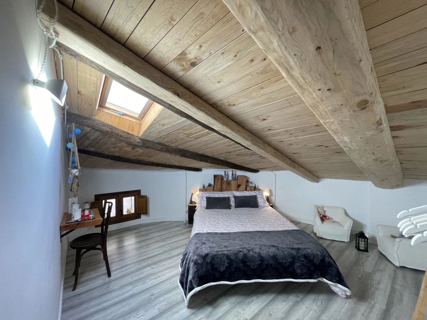 En el segundo piso de un edificio histórico con más de 200 años, este alojamiento con encanto combina ladrillo artesanal, vigas de madera y piedra vista, creando un ambiente único y acogedor.