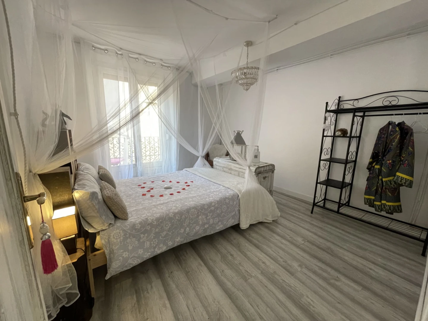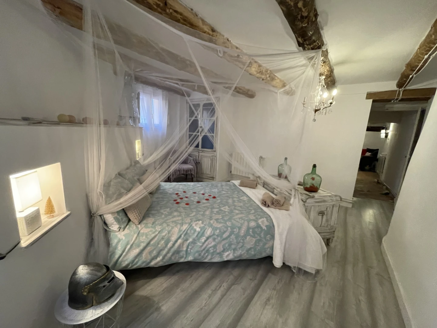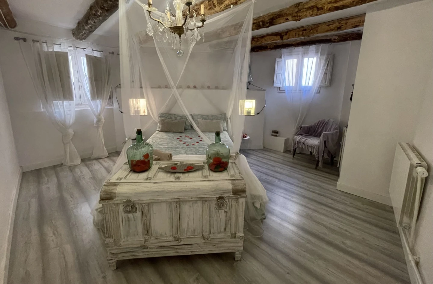 Dispone de 2 dormitorios con camas dobles con dosel, un elegante baño con bañera de hidromasaje doble con luz y música, y un salón-cocina-comedor diáfano con sofá cama para dos plazas adicionales (perfecto para niños). La cocina está totalmente equipada y te recibirá un kit de bienvenida con café, té e infusiones.